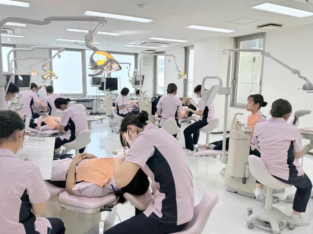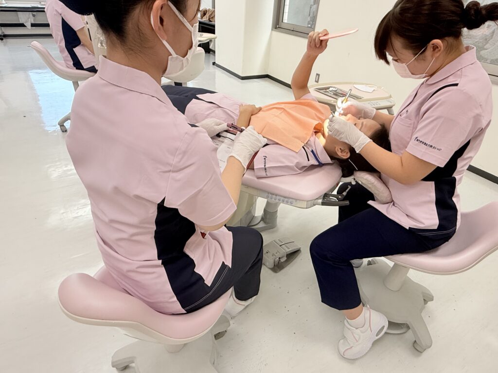 模型(ファントム)を使った基礎の練習や試験も終え、いよいよ歯に付着する歯石など沈着物をスケーラーを使って