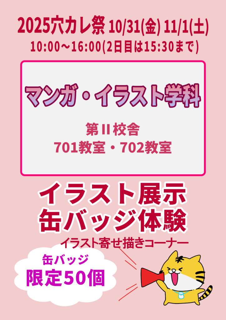 マンガイラスト学科では、1.2年生全員によるイラスト作品展示のほか、「オリジナル缶バッジ作り体験」と「イラスト寄せ書きコーナー」 を「1年生藤田君によるライブペイント」を実施します。