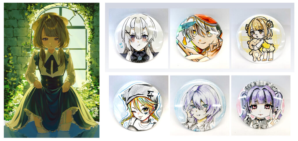 左:1年生のイラスト作品 右:学生が制作したイラスト缶バッジ