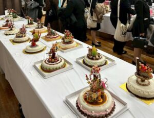 授業で取り組んだマジパン、ヘクセンハウス、ガレット・デ・ロワ、飴細工の作品だけでなく、普段目にする機会の少ないシュガークラフトなどの作品もありました。