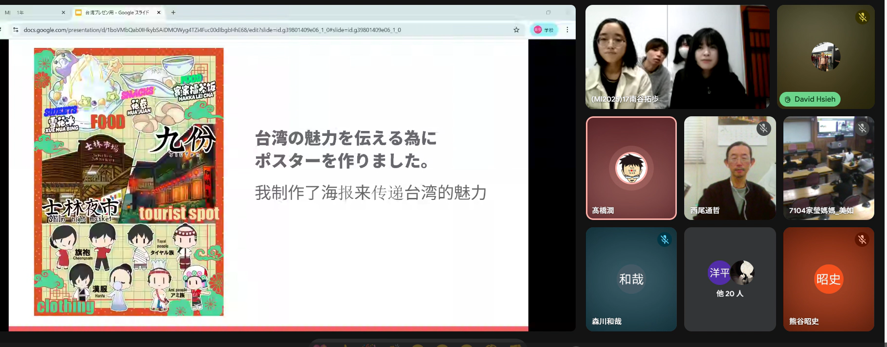 マンガ・イラスト学科の1年生は、全チームが一次審査を通過したため、最終プレゼンに向けてオンラインでのプレゼン練習にも力を入れました。本番では、4チームとも練習の成果を発揮し、制限時間をうまく使いながら、堂々と台湾の魅力を伝えることができました。チーム内でしっかりコミュニケーションを取りながら作品を完成させ、さらに自信を持ってプレゼンに臨めた経験は、学生たちにとって大きな経験になったと思います。