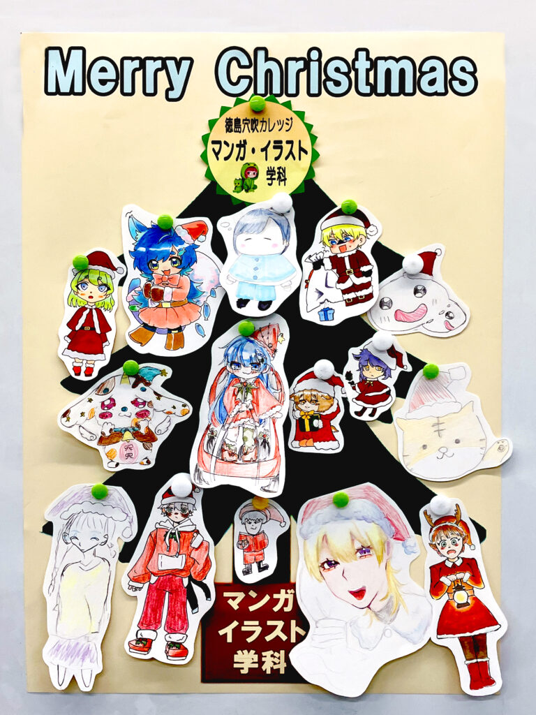 12月20日(土)に行われたマンガ・イラスト学科のオープンキャンパスのテーマは、「アレンジしたサンタを描いてみよう!」でした。 参加者の皆さんが描いたサンタを、アシスタントの学生が1本のクリスマスツリーに飾り付け、一人ひとりの作品が集まり、ひとつの大きな作品が完成しました。