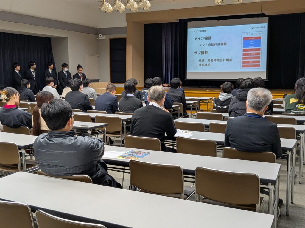 産学連携授業でお世話になっている穴吹ソフトプラス 天羽統括部長に学生作品を評価して頂きました。