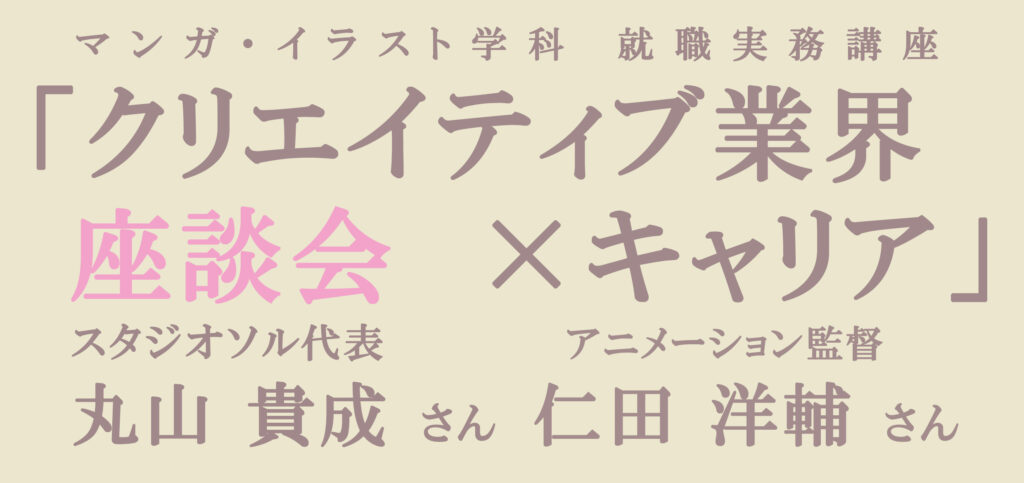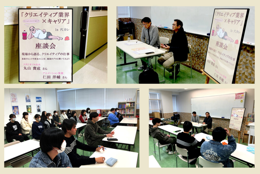 マンガ・イラスト学科の就職実務講座として、徳島でクリエイティブな仕事をディレクションするスタジオソル代表 丸山 貴成さん、そしてアニメーション監督 仁田 洋輔さんのお二人をお迎えし、「クリエイティブ業界 × キャリア」をテーマに座談会を開催しました。