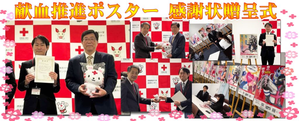 2月10日、学内クラブ活動「美術部」部員(アニメーション学科1年 仁井田 優伍さん) が制作した「献血推進ポスター」が評価され、徳島県赤十字血液センター所長 新谷様より感謝状を贈呈されました!