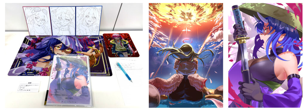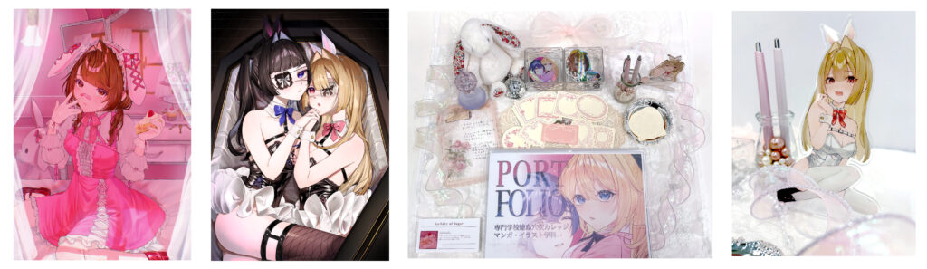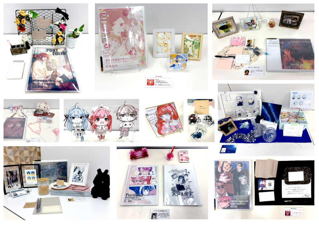 キャラクターデザインやマンガ作品に加え、イラストステッカー、アクリルスタンド、缶バッジなどのグッズ制作も展示され、表現の幅広さを感じられる内容となりました。