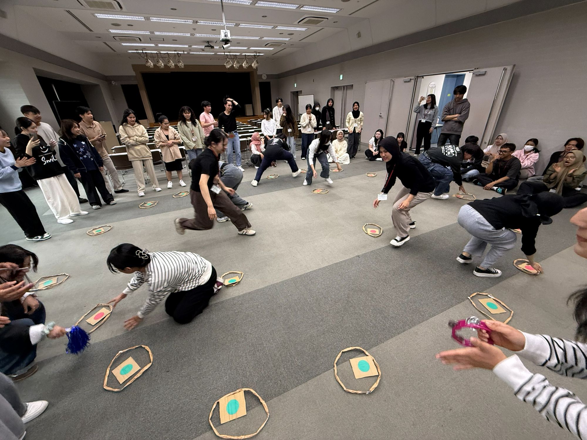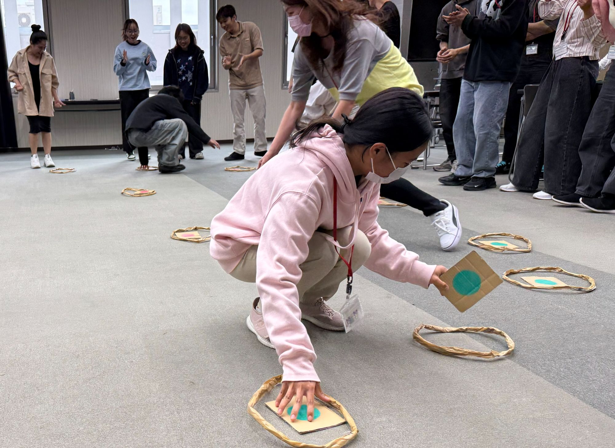 ルール: 床に置かれた「赤」と「緑」の両面カードを、制限時間内に自分のチームカラーへひっくり返していきます。1チーム4人の対戦形式。