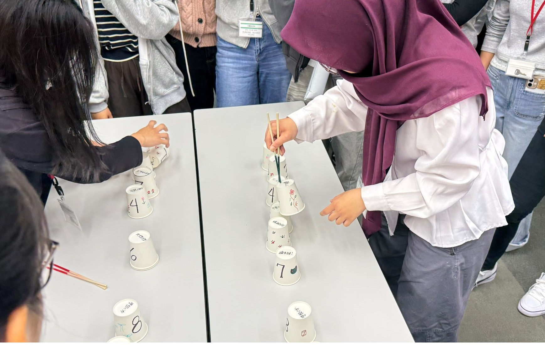ルール: 紙コップの底のふちをお箸で掴み、決められた番号順に重ねていきます。途中で落としたり、重ねるのを失敗したりした場合は、最初からやり直しとなります。