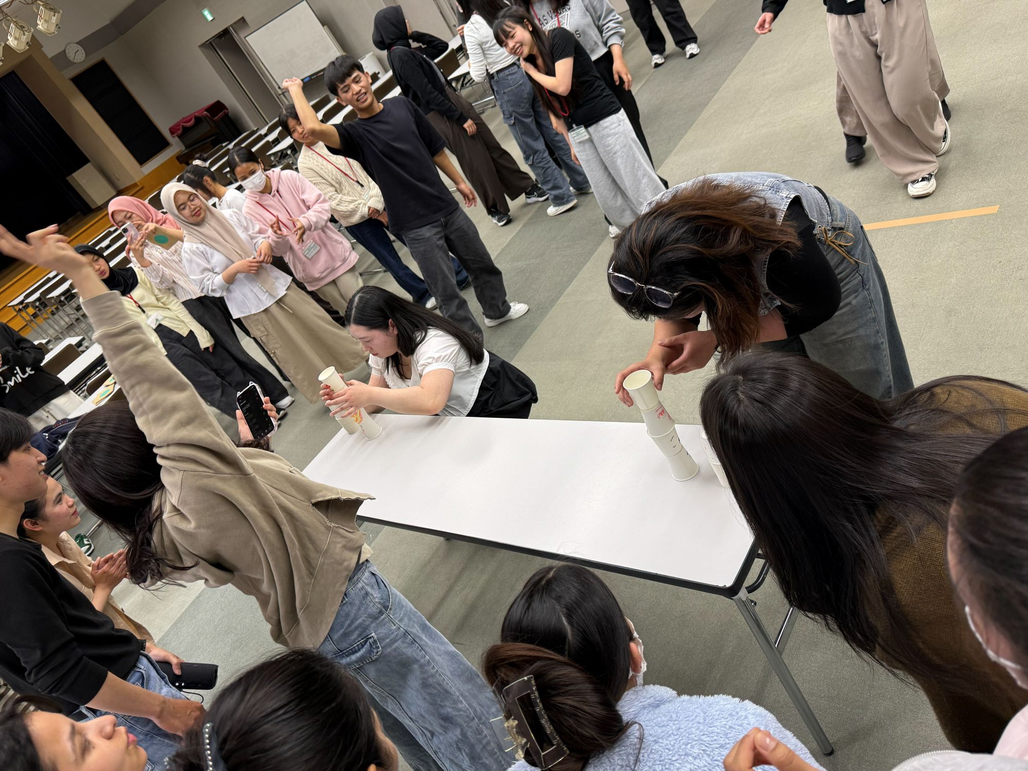 ルール: 1チーム4人で、一人ひとつずつ順番に紙コップを積み上げてタワーを作ります。タワーが倒れた場合は、最初から積み直しとなります。