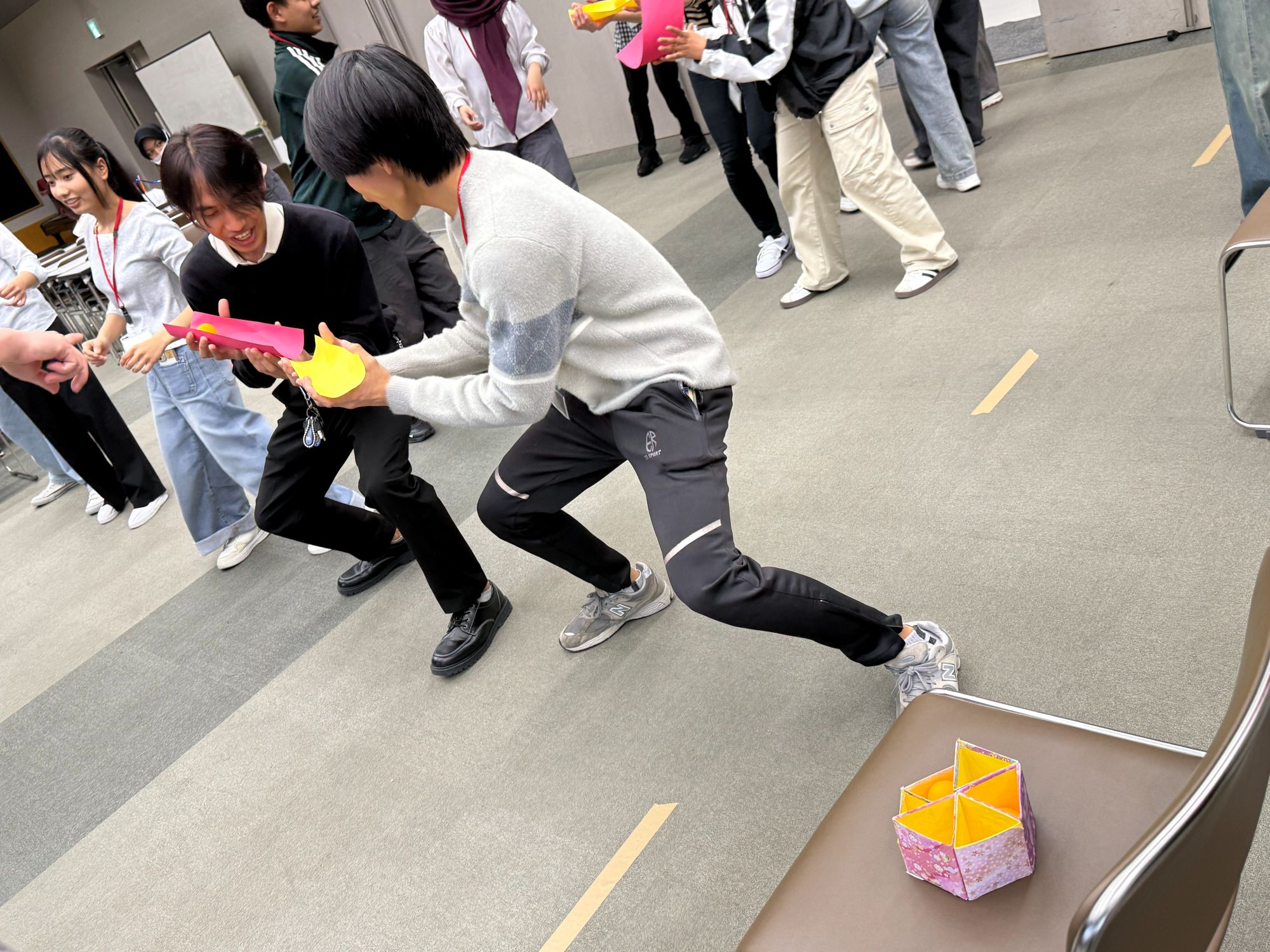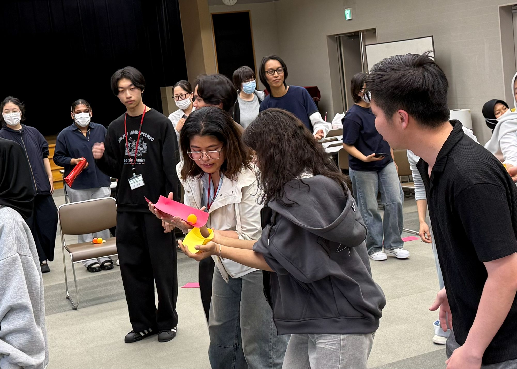 ルール: 手ではなく「紙」を使い、チームで協力してピンポン玉を目的地まで運びます。
