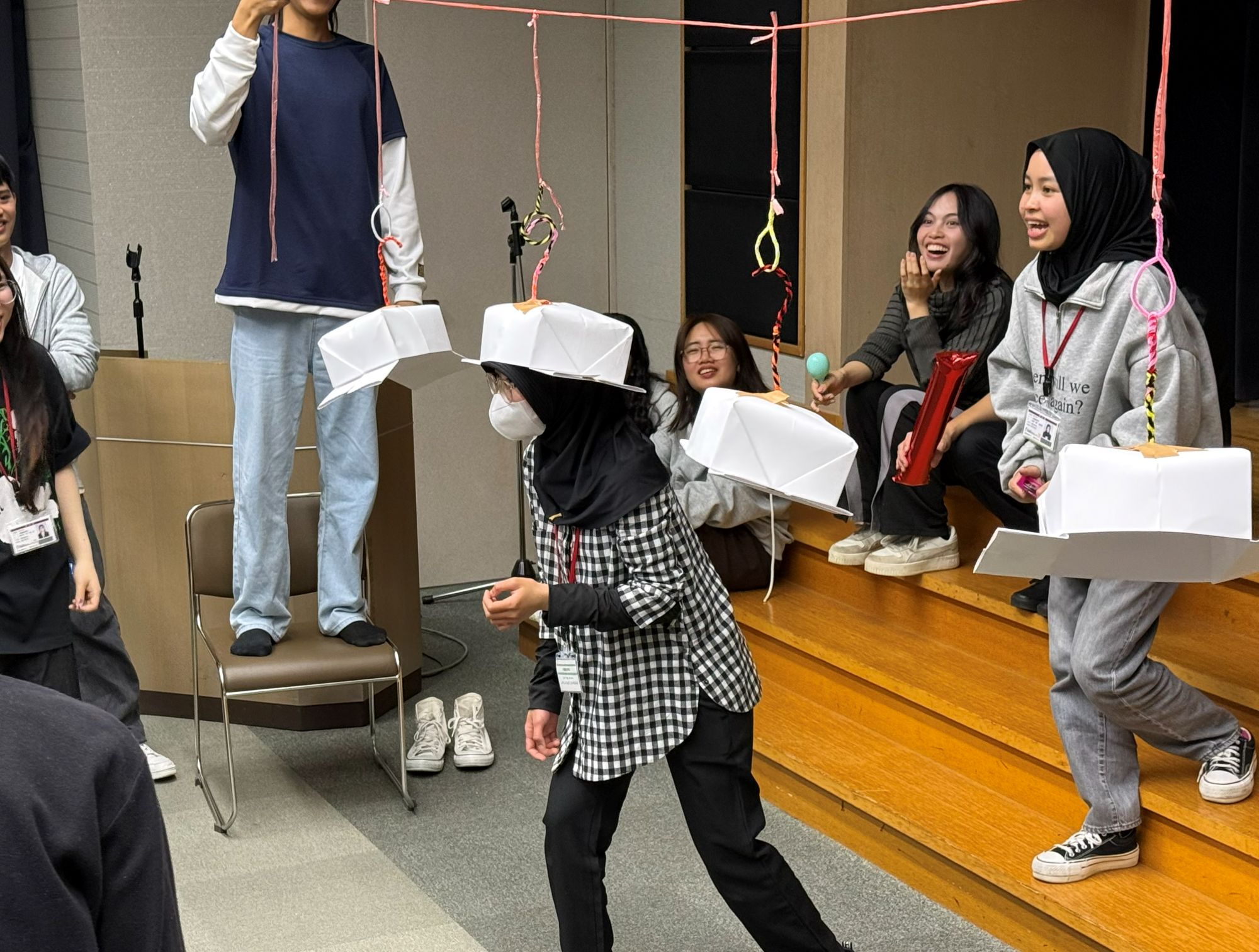 ルール: フック付きの帽子をかぶり、手を使わずにリングへフックを引っ掛けます。